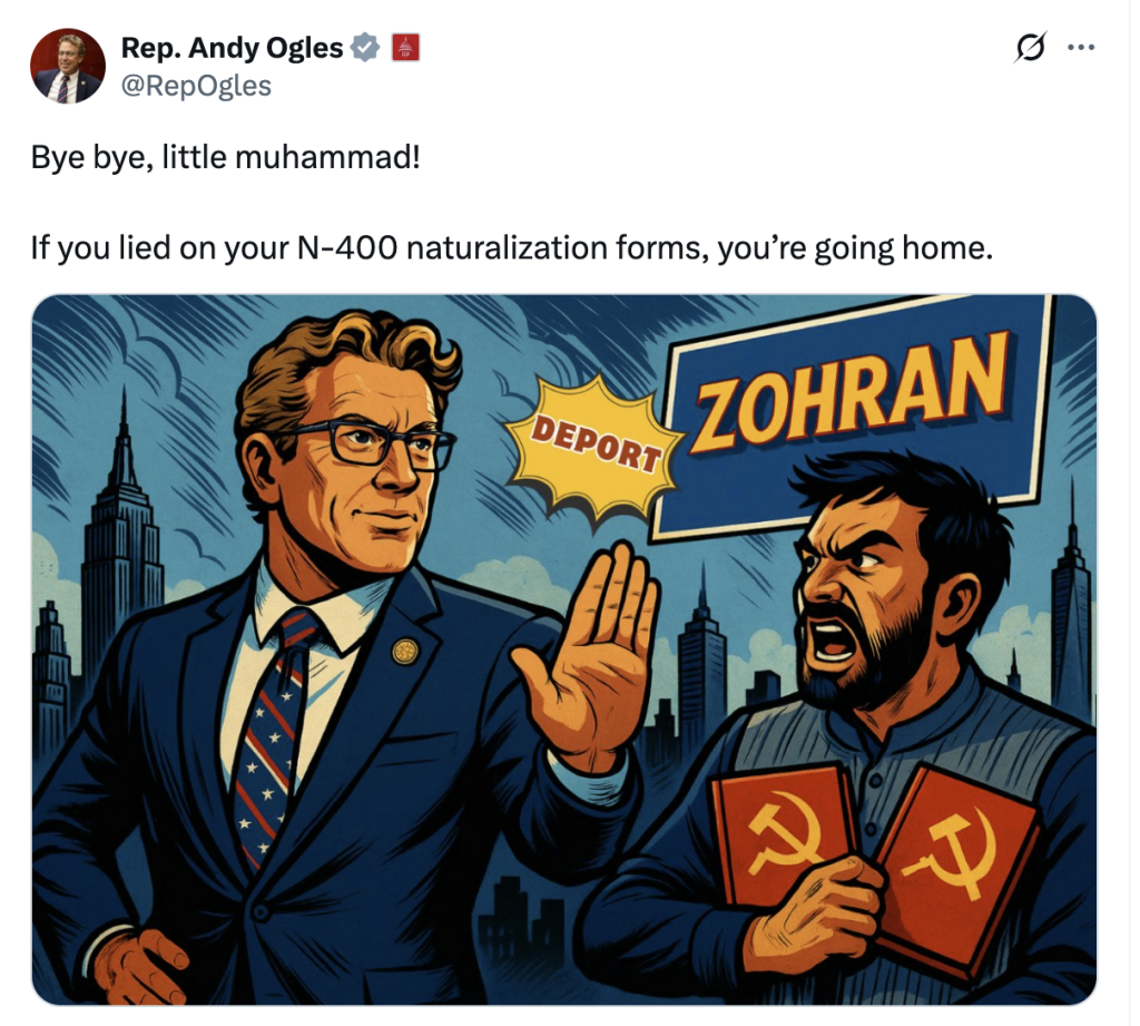 El 26 de junio de 2025, Ogles envió una carta formal a la fiscal general Pam Bondi pidiendo investigar si Mamdani mintió en sus formularios de naturalización (N-400), ocultando sus simpatías terroristas para obtener la ciudadanía estadounidense. La evidencia incluye un artículo del New York Post que documenta el apoyo de Mamdani a individuos condenados por terrorismo y su elogio a la Holy Land Foundation (HLF), organización condenada en 2008 por financiar a Hamas.