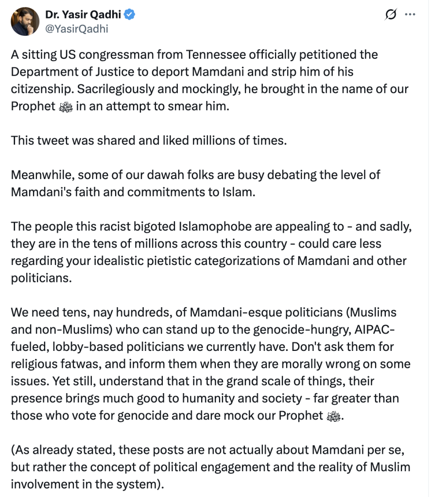 “Necesitamos cientos de políticos estilo Mamdani (musulmanes y no musulmanes) que puedan hacer frente a los políticos que promueven genocidios y se burlan de nuestro profeta ﷺ. Aunque estén mal en algunas cosas, su presencia trae más bien que mal a la sociedad.”